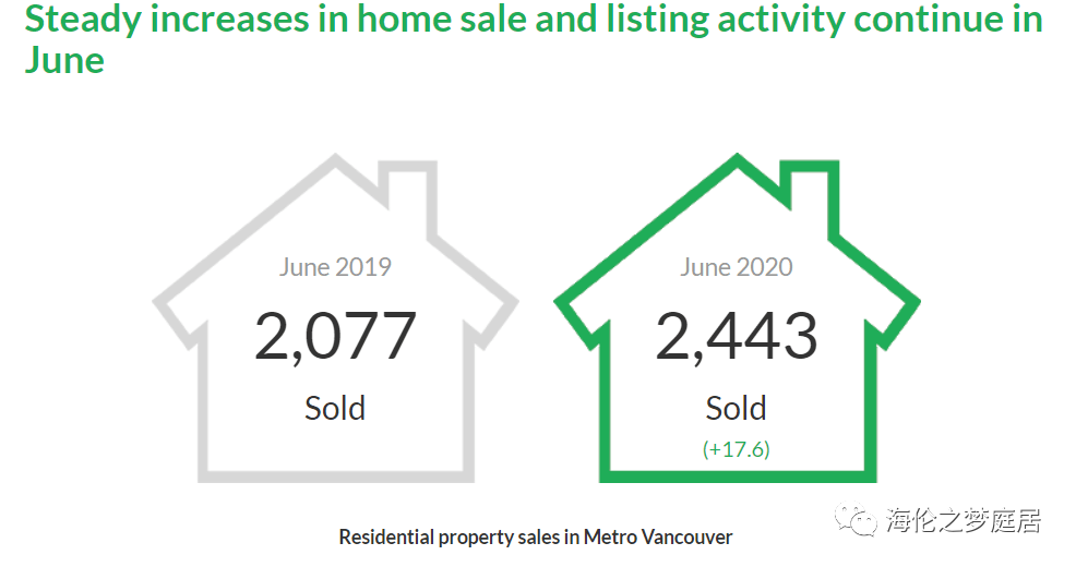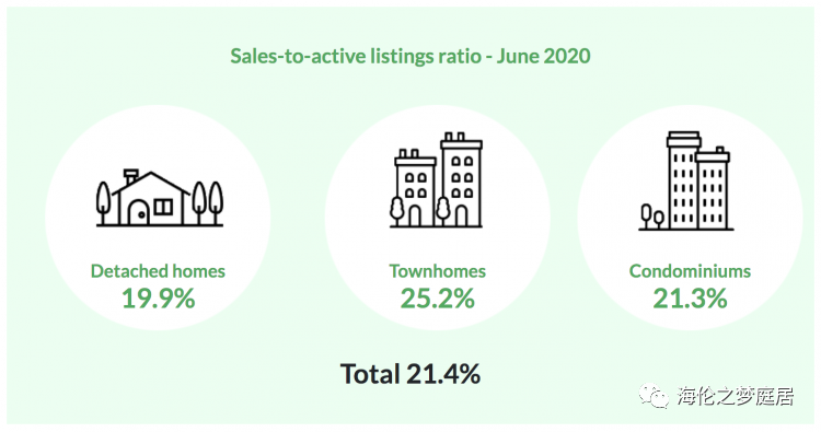 挂牌量:2020年7月,共有5,948套独立屋,城市屋和公寓在MLS挂牌,相比2019年7月的挂牌4,613套增加了28.9%, 相比2020年6月的挂牌量5,787套增加了2.8%。
